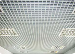 - Ячеистые подвесные потолки. Рельефное покрытие в виде сплошной решетки из алюминия идеально для работы системы пожаротушения. Еще одно его преимущество — естественная вентиляция и современный дизайн в стиле хай-тек. Такие параметры делают его незаменимым в местах массового скопления людей.