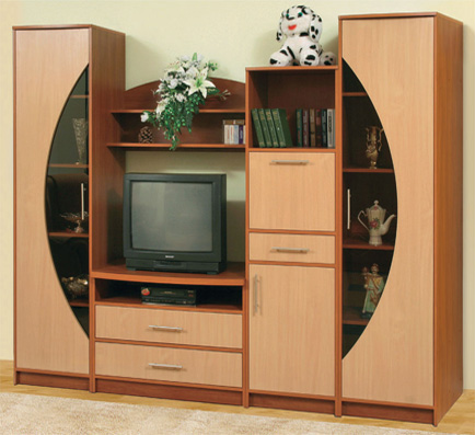 Стильная и комфортная. Изготавливается в сочетании двух цветов: яблони и бука. По желанию комплектуется шкафом и комодом, не требующими обязательного размещения вместе. В комплект входят два пенала, тумбы, секция РТВ. Возможна комплектация со шкафом.